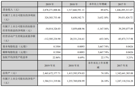 3月19日,宏創(chuàng)控股(002379,股吧)(002379)近日發(fā)布2019年年度報(bào)告,公告顯示,報(bào)告期內(nèi)實(shí)現(xiàn)營(yíng)收28.78億元,同比增長(zhǎng)89.65%;歸屬于上市公司股東的凈利潤(rùn)3.25億元,同比增長(zhǎng)3652.18%;基本每股收益為0.3504元,上年同期為0.0093元。
