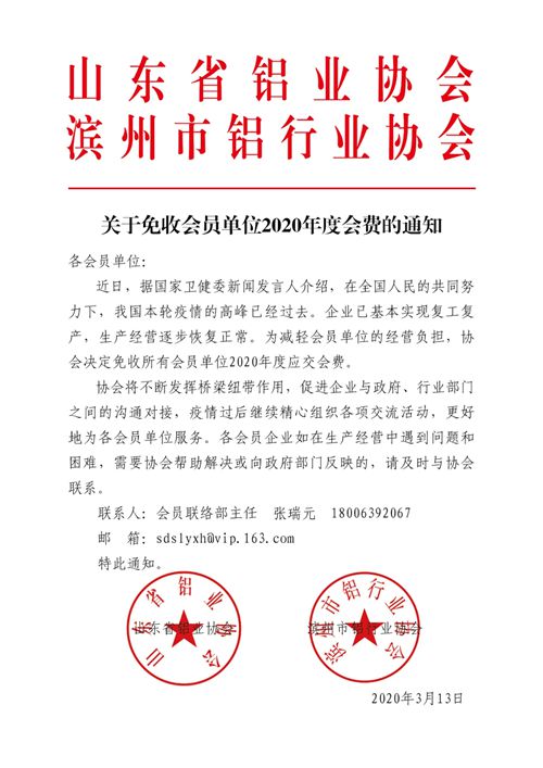 3月13日,山東省鋁業(yè)協(xié)會(huì)和濱州市鋁行業(yè)協(xié)會(huì)聯(lián)合發(fā)出通知,免收所有會(huì)員單位2020年度應(yīng)交會(huì)費(fèi)。